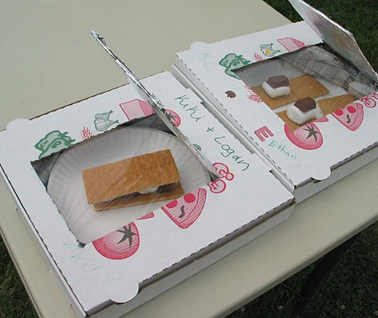 2) Have an adult carefully cut out 3 sides of a square in the lid of the box, leaving one edge connected. Do not cut out the fourth side of the square, which is the one closest to where the pizza box lid hinges. Gently fold the flap back along the uncut edge fold the window up along the uncut line. This will become your sun window.